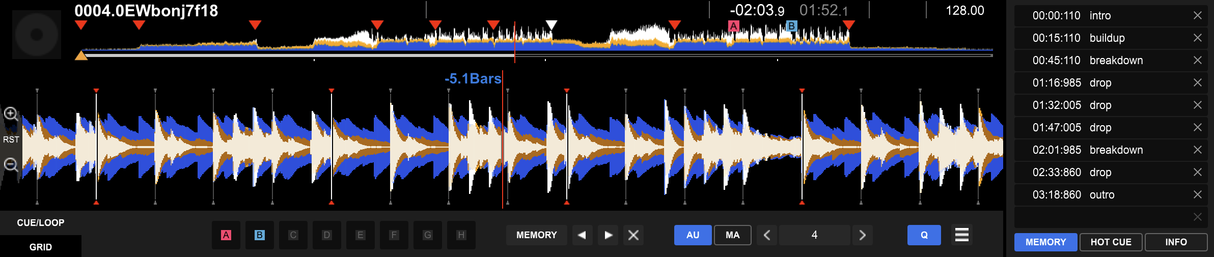 This section describes how to annotate track structures using Rekordbox and convert the annotations to JSON format. The image below shows an example screenshot of Rekordbox annotating 0004.0EWbonj7f18. We use Rekordboxβs memory cues to annotate segments, assisted by Rekordboxβs track analysis for beat and downbeat annotation.